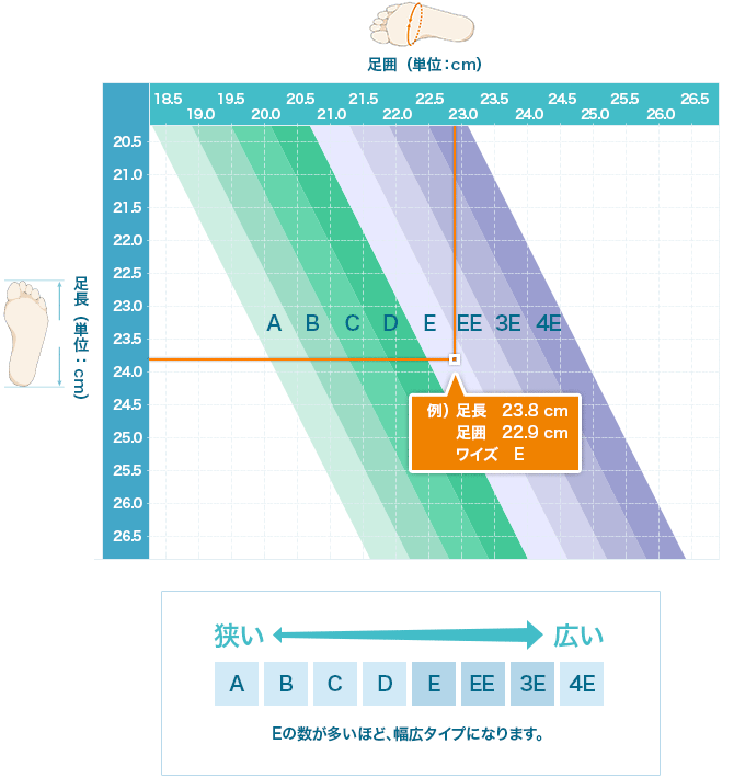 例えば足長が23.8cm、足囲が22.9cmの方の場合、表に当てはめてみると